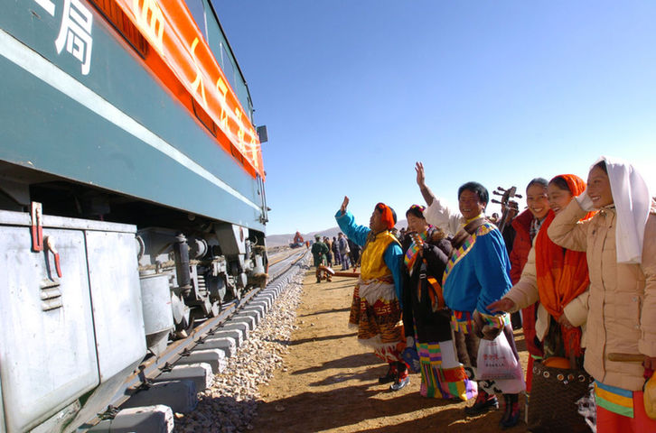 2004年10月10日,藏北群眾迎接火車(chē)抵達(dá)那曲。10月9日,青藏鐵路安多到那曲138公里的鋪軌完成。10月10日,從安多出發(fā)的西藏境內(nèi)第一列火車(chē)上午10點(diǎn)抵達(dá)藏北重鎮(zhèn)——那曲鎮(zhèn)。