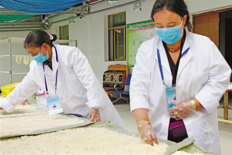 圖為聶榮縣色慶鄉(xiāng)雜瑪多種經營合作社工作人員對奶渣進行干燥處理。 記者 萬靖 謝偉 攝