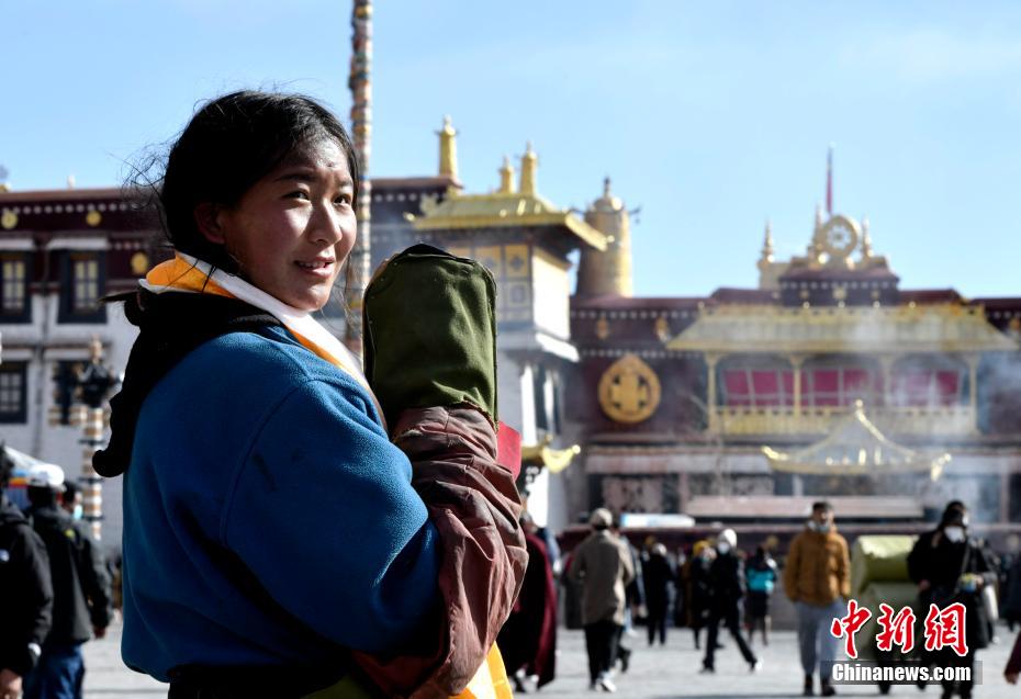 1月12日,西藏拉薩,來(lái)自西藏那曲的吉卓瑪歷經(jīng)31天的磕長(zhǎng)頭,順利抵達(dá)拉薩大昭寺。 李林 攝