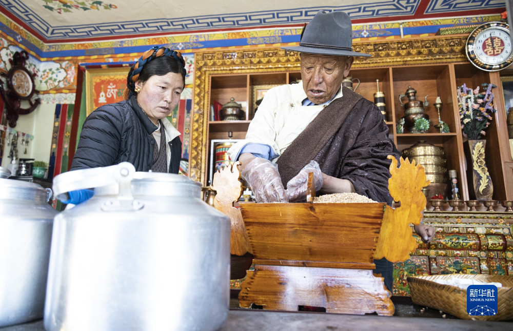 2月20日,在位于西藏拉薩市墨竹工卡縣門巴鄉(xiāng)的家中,扎西次仁用五彩青稞穗裝點象征吉祥的“切瑪”。新華社記者 孫非 攝