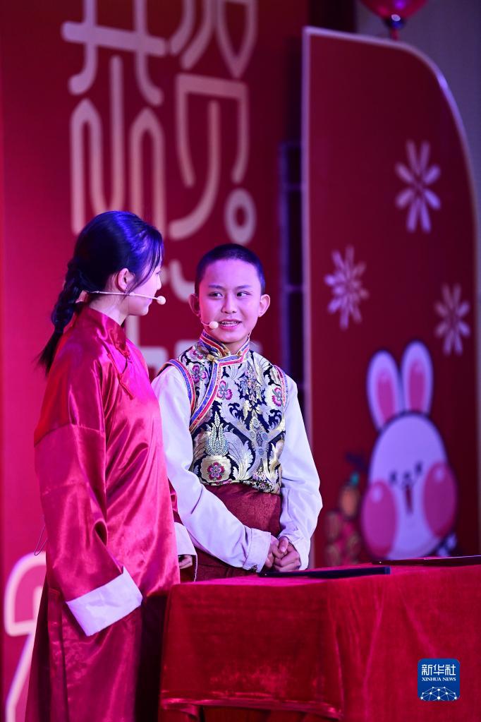 2月21日,在西安市浐灞第一中學(xué)舉行的藏歷新年團(tuán)拜活動(dòng)上,漢藏學(xué)生一起表演相聲。新華社記者 李一博 攝
