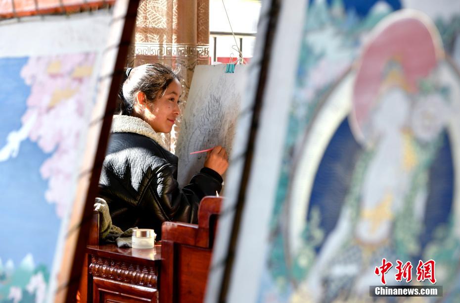 圖為3月8日,西藏拉薩,南草吉正在繪制唐卡。