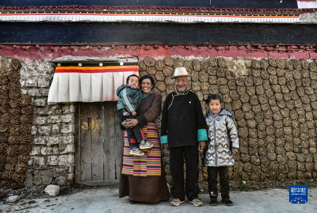 達國杰(右二)和家人在家門前合影(2021年3月22日攝)。新華社記者 孫瑞博 攝