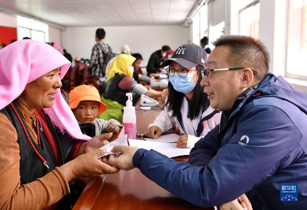 北京市第七批“組團式”援藏醫(yī)療隊專家、拉薩市人民醫(yī)院副院長汪紅兵(右)為居民義診(2022年6月9日攝)。新華社記者 張汝鋒 攝