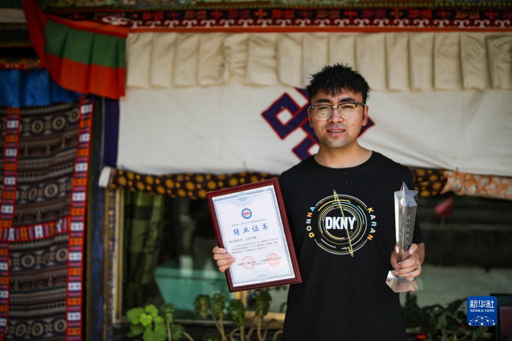 “格?;ㄩ_”大學生就業(yè)創(chuàng)業(yè)特訓營學員、江蘇今世緣酒業(yè)股份有限公司甘青藏大區(qū)業(yè)務(wù)經(jīng)理土旦平措展示特訓營結(jié)業(yè)證書和“區(qū)外就業(yè)之星”獎杯(2022年6月23日攝)。新華社記者 姜帆 攝