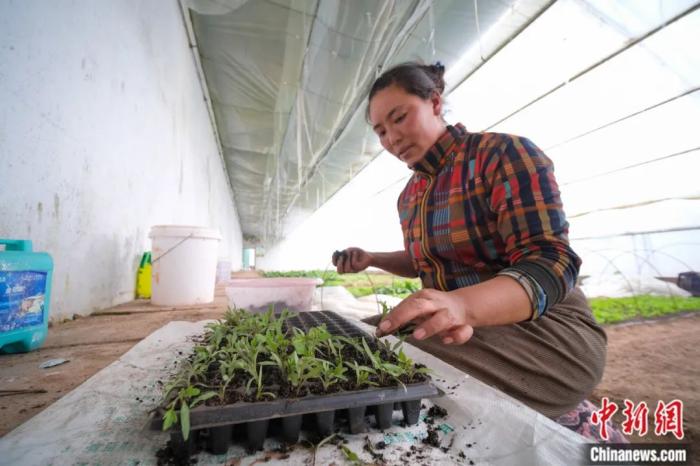 西藏阿里地區(qū)改則縣生態(tài)農(nóng)牧業(yè)產(chǎn)業(yè)園溫室大棚內(nèi)的工作人員正在進(jìn)行育苗工作。何蓬磊 攝