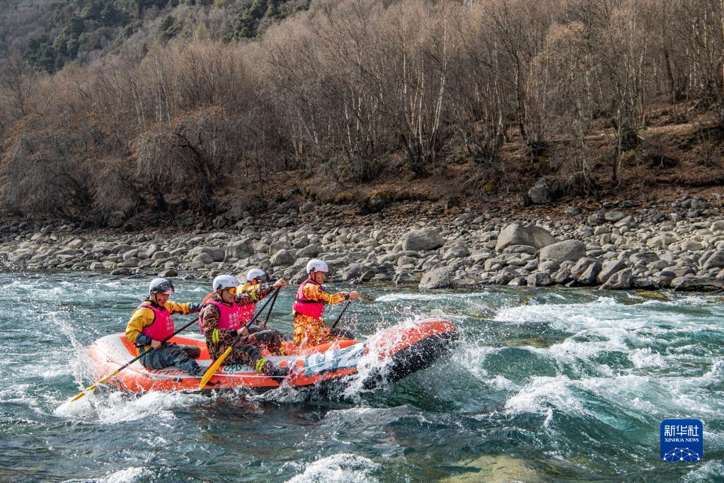 4月16日,西藏旅游股份有限公司漂流隊(duì)(前)在激流漂流筏追逐賽中。最終,他們獲得亞軍。新華社記者 孫非 攝