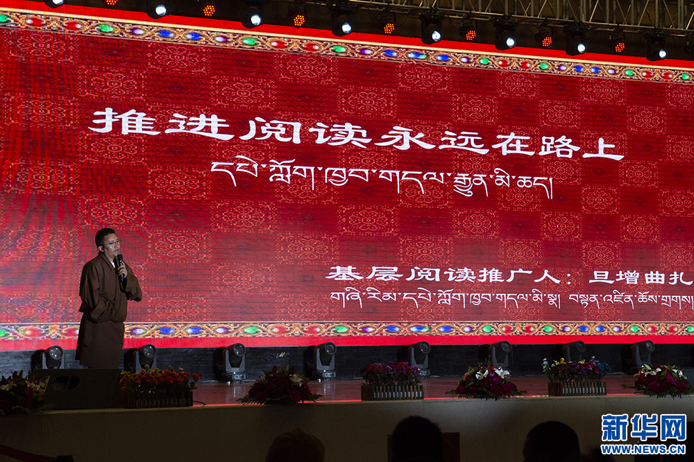 4月23日,基層閱讀推廣人旦增曲扎在展示基層閱讀推廣成果。新華網(wǎng) 旦增努布 攝