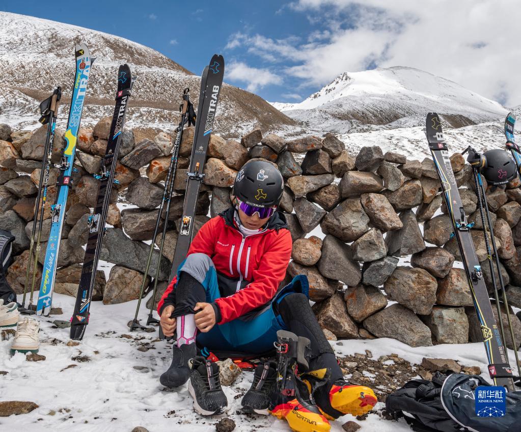 在西藏拉薩市當雄縣羊八井鎮(zhèn),玉珍拉姆在訓練前為雪板粘貼止滑帶(5月2日攝)。新華社記者 孫非 攝