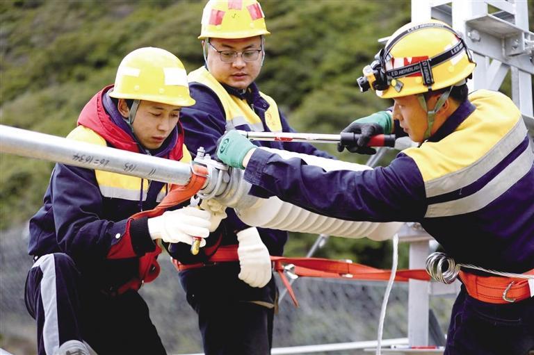 “高空作業(yè),大家把安全帽戴好!”彭江江不時(shí)提醒道。王偉點(diǎn)頭示意回應(yīng)工長彭江江,隨后輕車熟路地將安全帶系在斜腕臂上,右手緊緊抓住上方的腕臂,右腳跨上懸空的定位管,左腳一蹬,穩(wěn)穩(wěn)地站在了斜腕臂上。工友蔣瀟和次仁加布也嫻熟地爬了上來,他們動(dòng)作靈活協(xié)調(diào),身手敏捷矯健,整個(gè)過程連貫一通,無一點(diǎn)拖泥帶水。