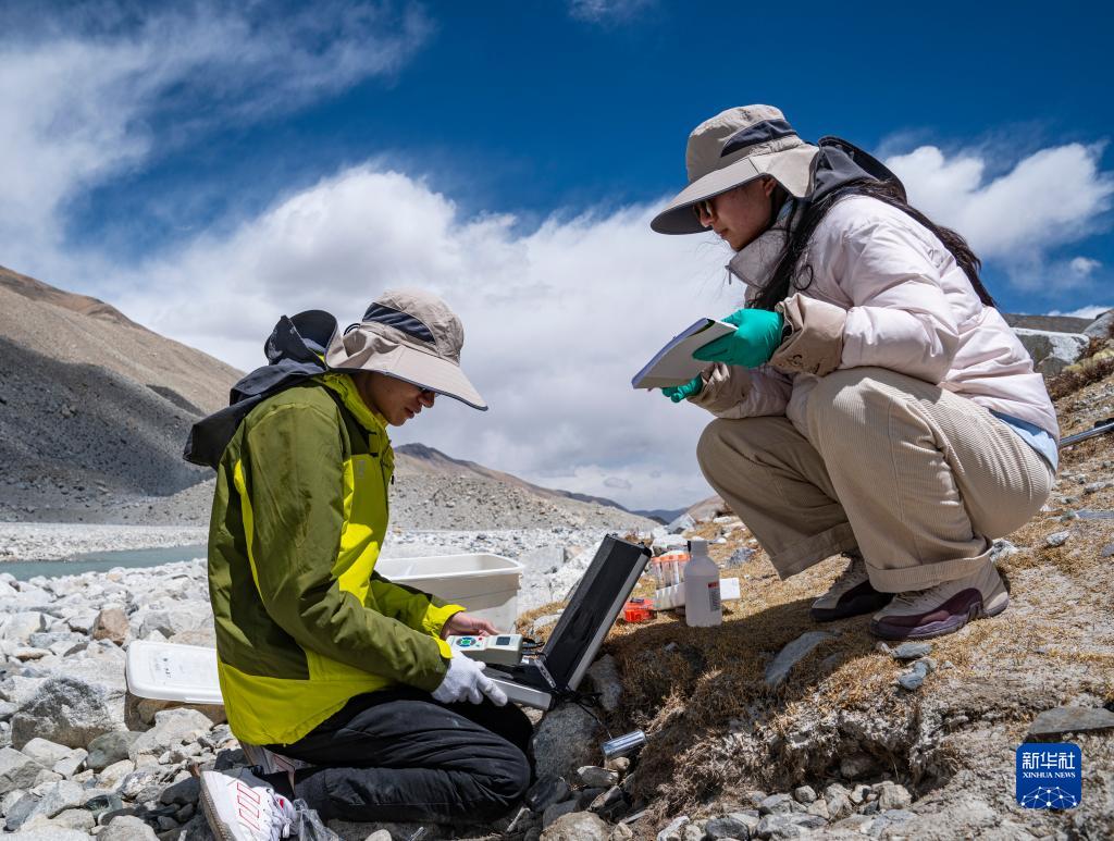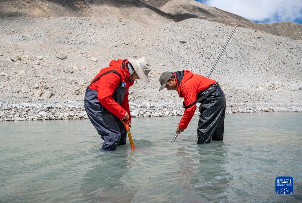 在珠峰登山大本營(yíng)附近,來(lái)自西藏大學(xué)生態(tài)環(huán)境學(xué)院的科考隊(duì)員在進(jìn)行水生態(tài)調(diào)查(5月22日攝)。新華社記者 孫非 攝