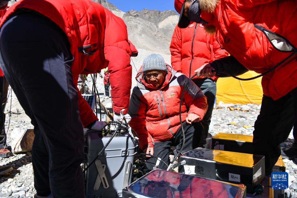 在珠峰登山大本營(yíng)附近,第二次青藏科考高海拔氣象梯度觀測(cè)小組負(fù)責(zé)人趙華標(biāo)(中)在指導(dǎo)科考登頂隊(duì)隊(duì)員架設(shè)自動(dòng)氣象站(5月9日攝)。新華社記者 晉美多吉 攝