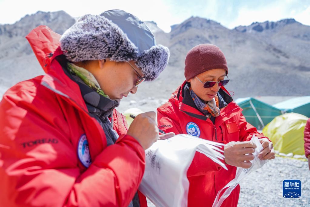 在珠峰登山大本營(yíng),中國(guó)科學(xué)院西雙版納熱帶植物園研究員蘇濤(右)和同事在樣品自封袋上做標(biāo)記(5月14日攝)。新華社記者 孫非 攝