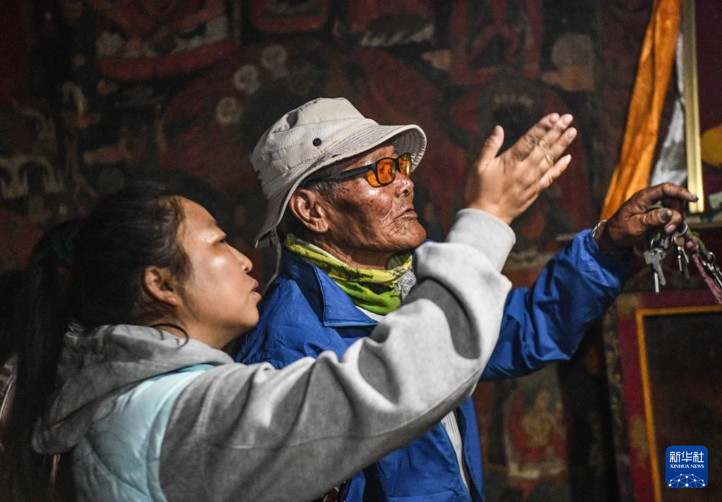 皮央和東嘎石窟遺址文保員仁增旺扎老人給游客講解壁畫(5月26日攝)。新華社記者 晉美多吉 攝