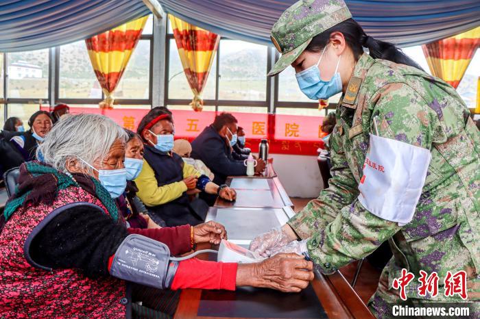 圖為醫(yī)療隊軍醫(yī)為村民測量血壓?!≈煳男?攝