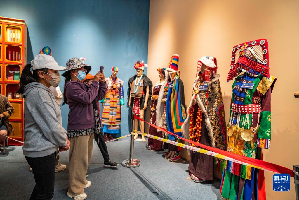 幾名游客在拍攝西藏各地特色服裝(6月17日攝)。新華社記者 孫非 攝