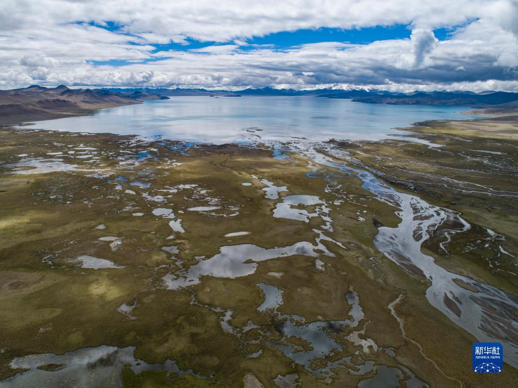 這是7月4日拍攝的普莫雍錯湖邊的濕地(無人機照片)。新華社記者 孫非 攝