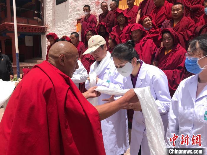 7月11日,來自北京的10余位醫(yī)療專家在邊壩寺開展義診活動。圖為僧眾和寺管會工作人員向?qū)<耀I哈達。陳建新 攝
