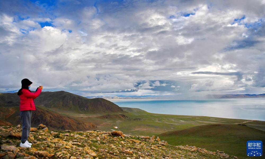 游客在扎日南木錯湖畔拍攝(8月19日攝)。新華社記者 張汝鋒 攝