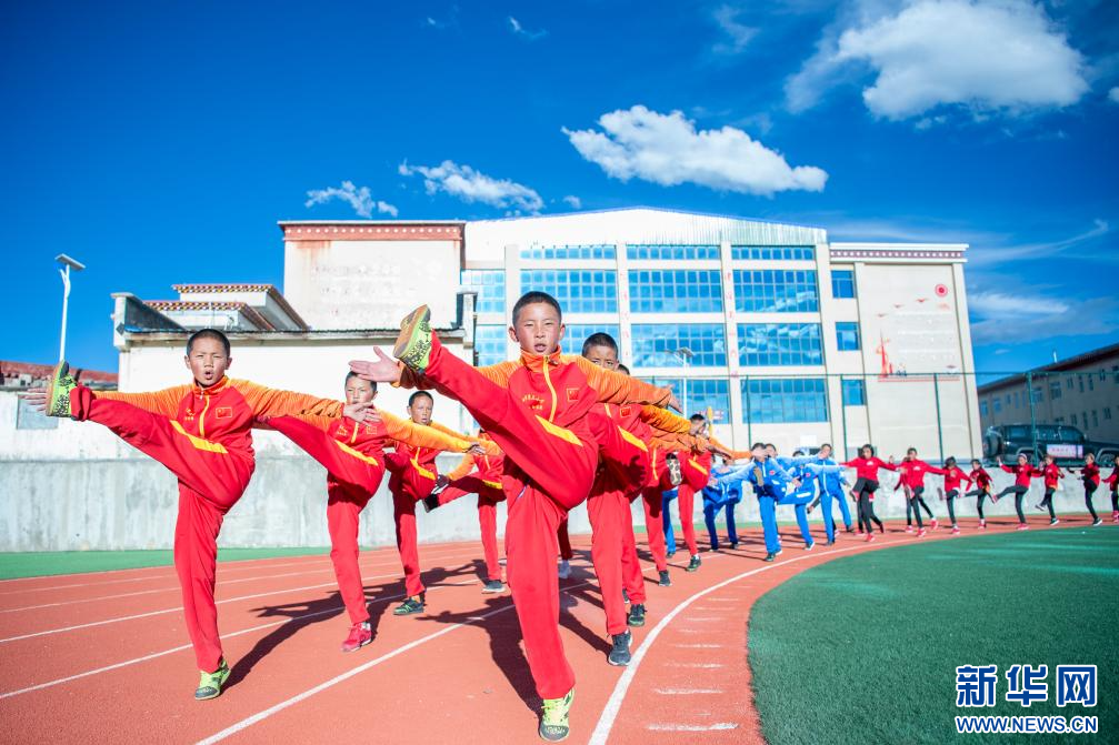 圖為那曲市第三小學學生在做體能訓練(9月5日攝)。新華網(wǎng) 旦增努布 攝