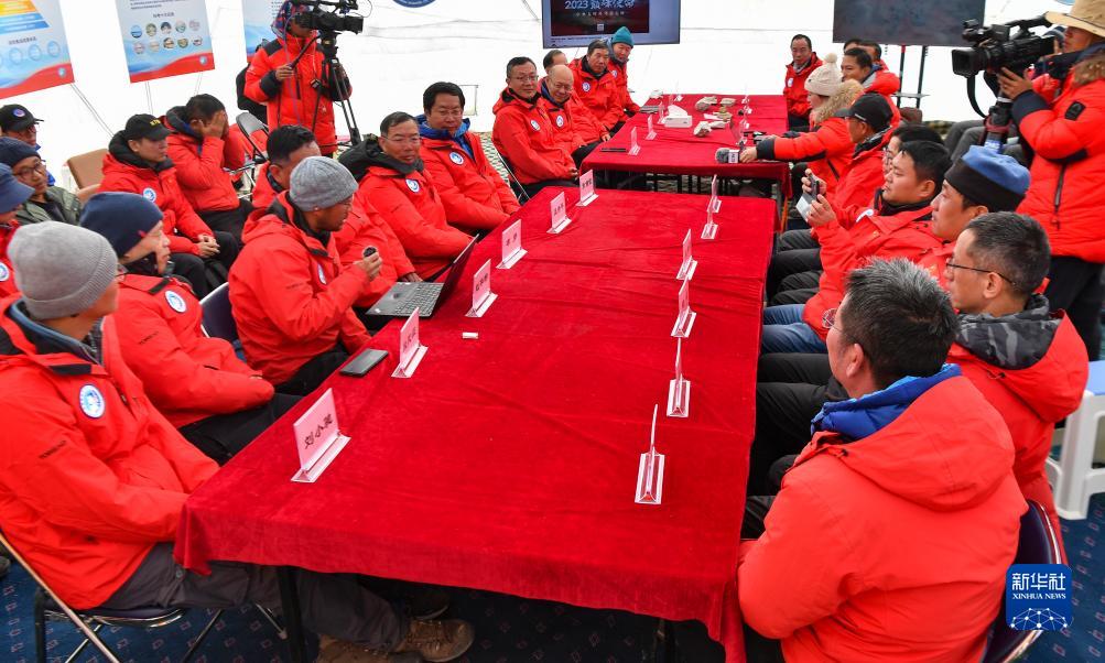 在海拔4950米的卓奧友峰科考大本營(yíng),科考隊(duì)員趙華標(biāo)(手拿麥克風(fēng)者看電腦者)宣讀剛剛接收到的頂峰氣象觀測(cè)數(shù)據(jù),標(biāo)志著峰頂自動(dòng)氣象站架設(shè)成功,成功傳回觀測(cè)數(shù)據(jù)(10月1日攝)。