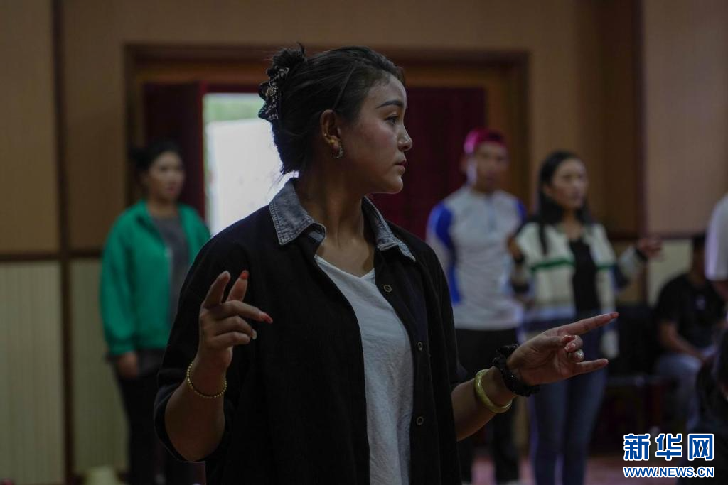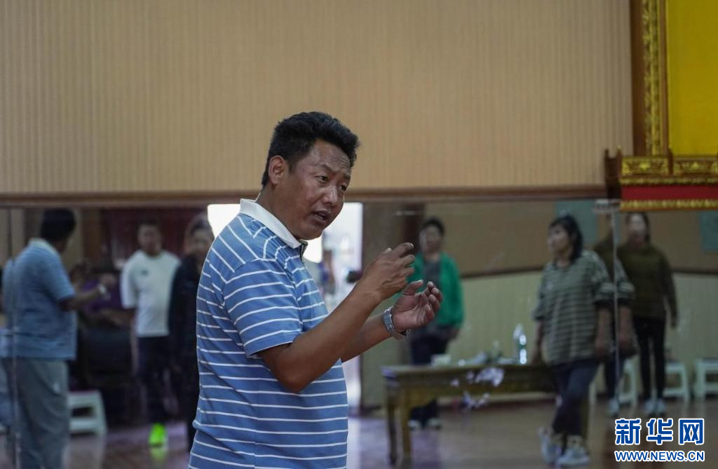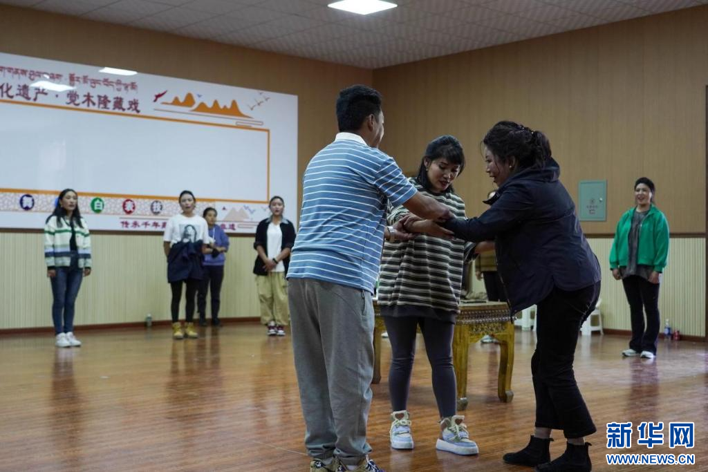 “像這樣,動作幅度大一點,我們再來一次。”排練室里,西藏自治區(qū)級非物質文化遺產(chǎn)傳承人、覺木隆藏戲傳承人洛桑扎西正糾正演員們的動作,伴隨著有力的鼓點,藏戲《白瑪文巴》的排練正在進行。