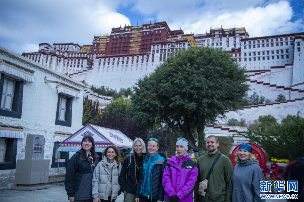 10月18日,外國游客在布達(dá)拉宮前合影留念。新華網(wǎng) 旦增努布 攝