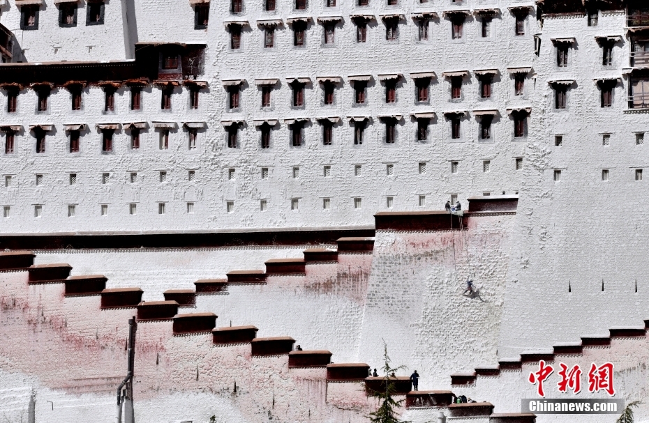 10月19日,西藏拉薩,工作人員對布達拉宮外墻噴灑涂料。每年秋冬交替時節(jié),布達拉宮外墻都要進行粉刷“美顏”。按照慣例,每季粉刷將在藏歷9月22日“神降節(jié)”前完成。