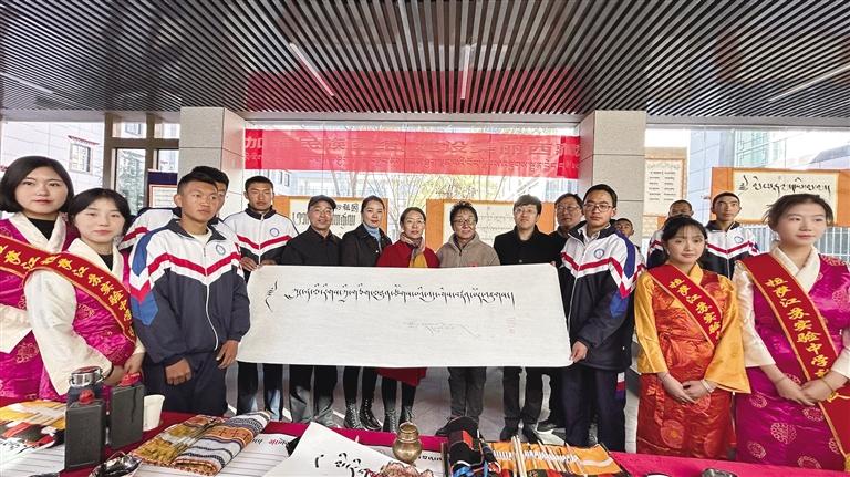 隨后,與會領導向江蘇實驗中學贈送了150套民族團結進步教育讀本。大家一同觀看了書畫社同學現場進行的民族團結進步書畫作品創(chuàng)作。中國書協(xié)會員、自治區(qū)政協(xié)委員、拉薩市政協(xié)常委、區(qū)市書協(xié)副主席南杰旺扎現場創(chuàng)作了“鑄牢中華民族共同體意識”的藏文書法橫幅贈送給江蘇實驗中學。