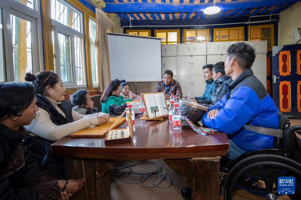 西藏拓崗文化傳播有限公司負(fù)責(zé)人覺列(右一)在直播前與直播團(tuán)隊(duì)討論直播方案(11月10日攝)。新華社記者 姜帆 攝