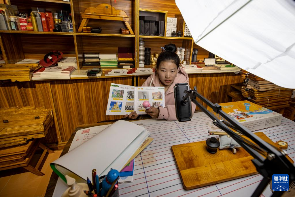 西藏拓崗文化傳播有限公司主播索朗德吉在直播銷售藏語學(xué)習(xí)文具(11月10日攝)。新華社記者 姜帆 攝