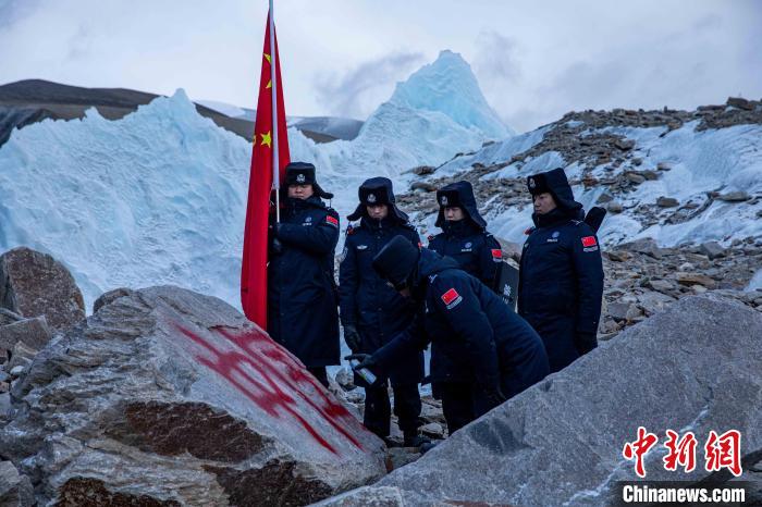 圖為普瑪江塘邊境派出所民警在海拔5600米的崗布冰川噴涂中國。郭遠(yuǎn)敬 攝