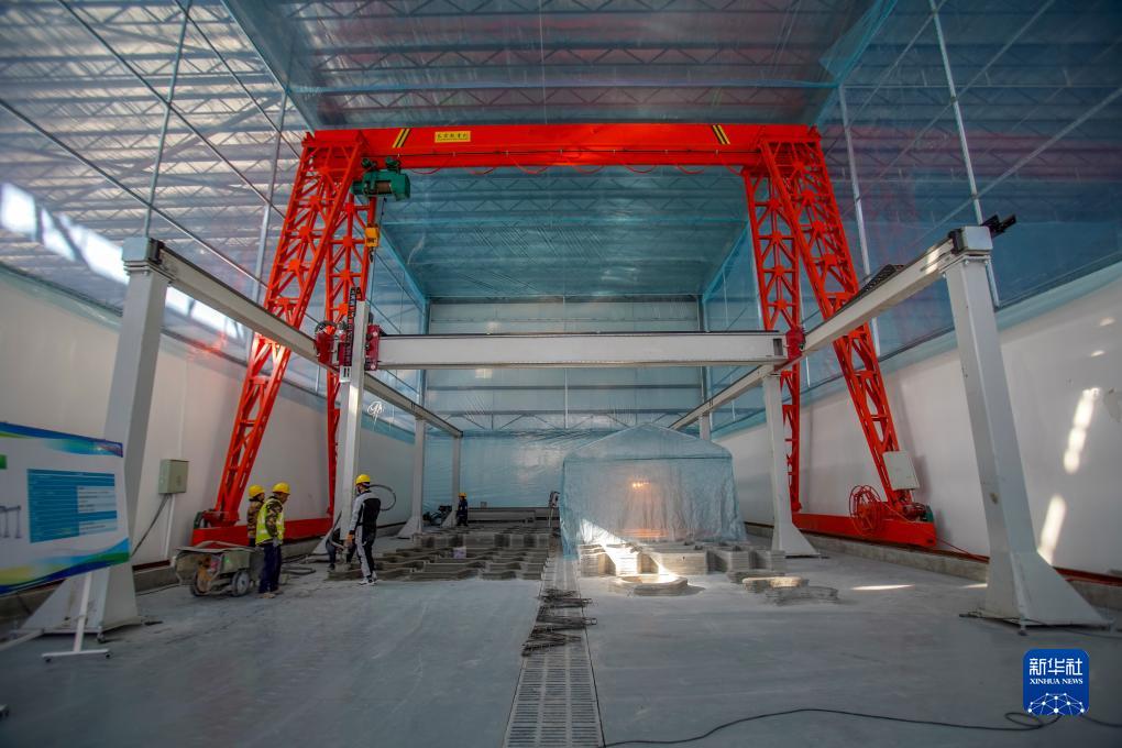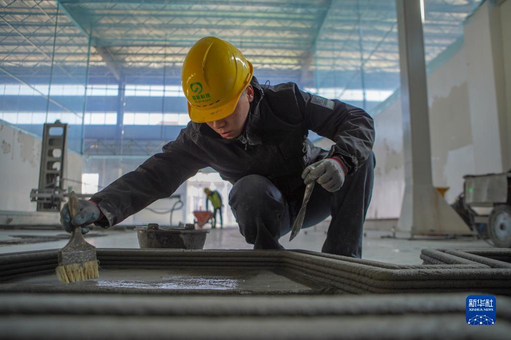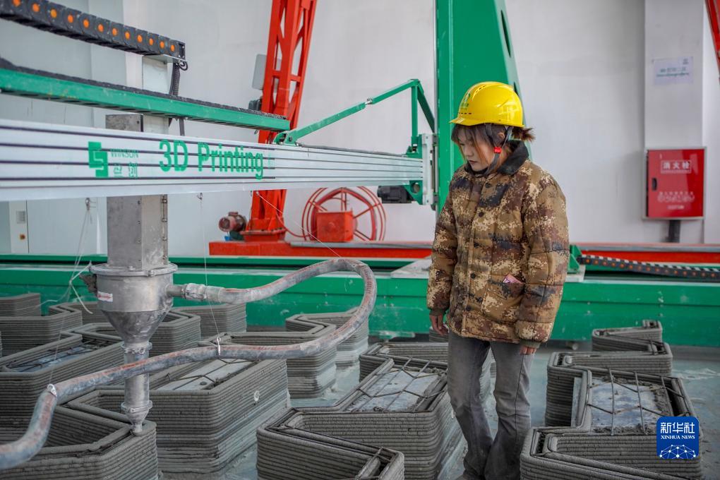 工人在一臺3D打印建筑機器旁工作(12月12日攝)。新華社記者 劉文博 攝