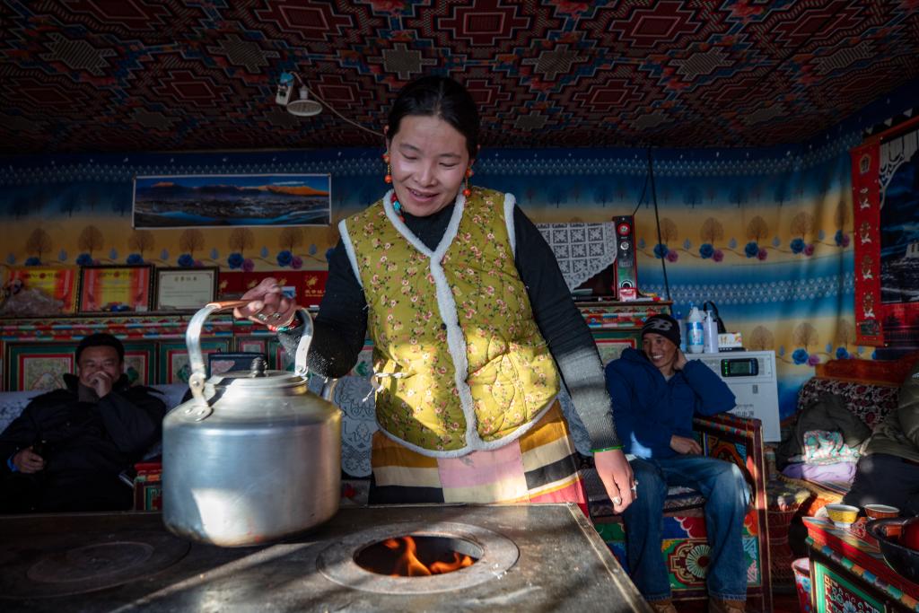 俄久鄉(xiāng)馬遷村嘎宗的家中明亮整潔,過(guò)冬的厚衣服摞在座椅上。將牛糞投入爐子中點(diǎn)燃,屋里的溫度逐漸升高。燒一壺?zé)崴?,喝一杯熱茶,屋外茫茫草原上的狂風(fēng),頓時(shí)變得不再可怕。嘎宗和女兒圍坐在爐邊,露出了笑容。