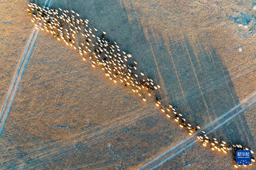 太陽落山,丹增家的羊從草場趕回棚圈(無人機照片,12月18日攝)。新華社發(fā)(旦增努布攝)