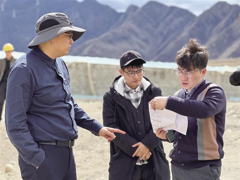 王宇(右一)在援藏項(xiàng)目現(xiàn)場(chǎng)核對(duì)施工圖紙。圖由王宇提供