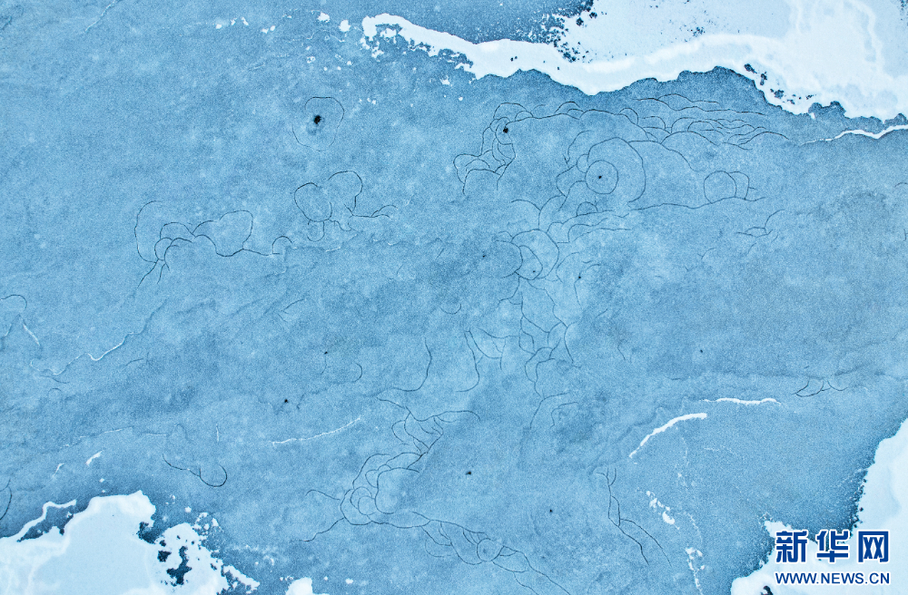 圖為1月3日降雪后扎塘魯錯湖面自然形成的冰紋(無人機(jī)照片)。 新華網(wǎng)發(fā) 姚力 攝