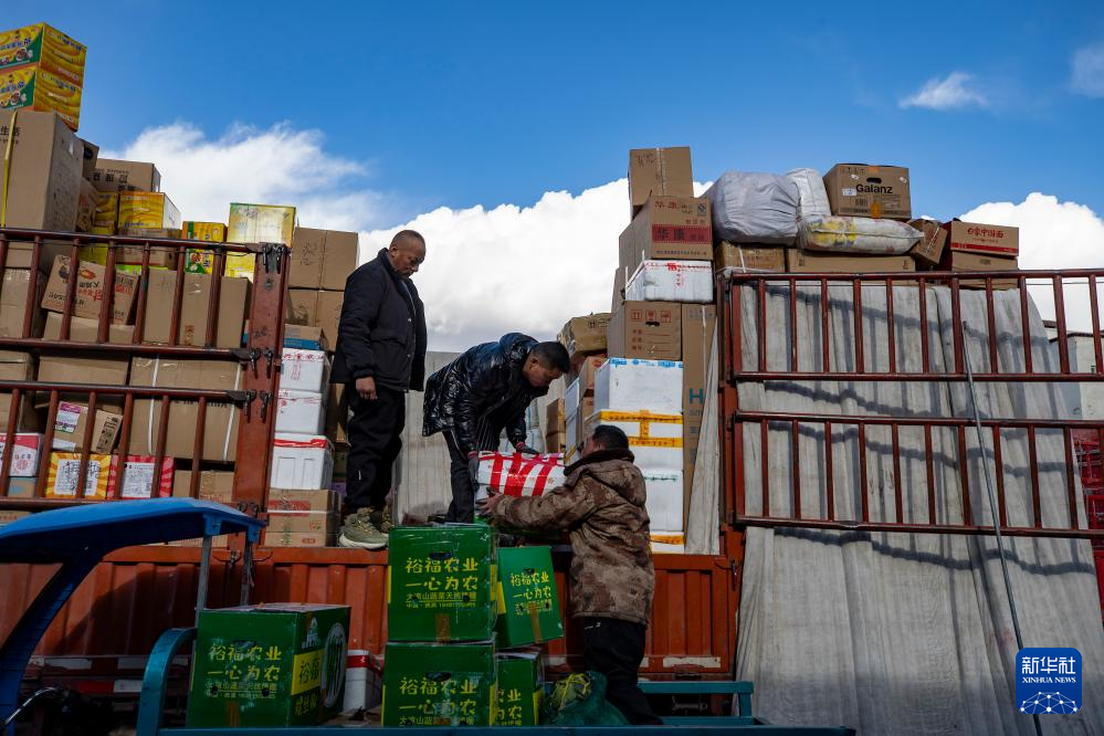 申扎縣供銷合作社員工在拉薩為偏遠鄉(xiāng)鎮(zhèn)果蔬配送試點項目的貨車上貨(1月2日攝)。新華社記者 姜帆 攝