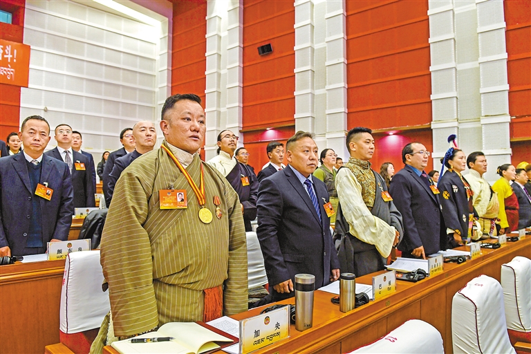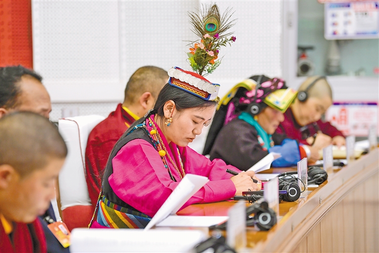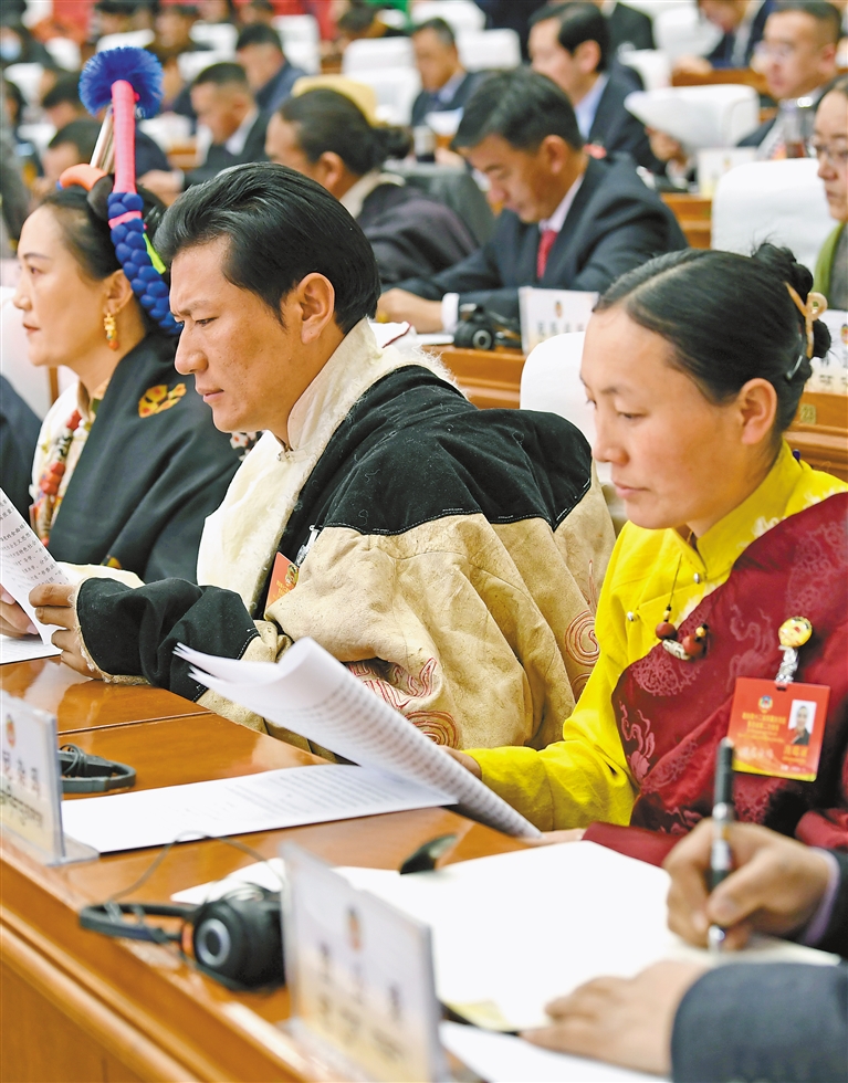 委員們認真聆聽政協(xié)常委會工作報告。 記者 洛桑 攝