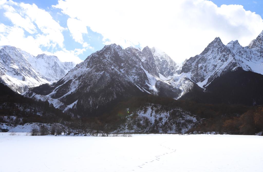 梅里雪山群峰和覆蓋白雪的冰湖(1月5日攝)。新華社記者關明輝 攝