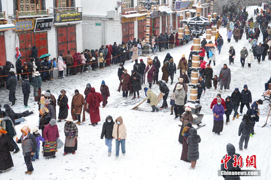 1月18日,西藏拉薩迎來一場大雪,雪后信眾在八廓街轉(zhuǎn)經(jīng)出行。布達(dá)拉宮銀裝素裹,分外美麗。圖為雪后信眾轉(zhuǎn)經(jīng)出行。