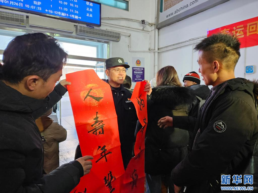 1月26日,在藏北高原零下20多攝氏度的那曲站,該站派出所民警按照上級安排部署,精心組織謀劃,凝聚全警力量,以“細致、精致、極致”的工作作風為萬千群眾平安出行保駕護航,通過開展志愿服務、法制知識宣傳、“寫春聯(lián)、送祝?!钡然顒?,積極營造“春運回家路、鐵警伴你行”的濃厚氛圍,讓廣大群眾在奔赴“回家”的路上更加暖心、安心、放心,不斷提升群眾安全感、幸福感和滿意度。