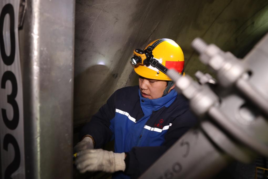 維護(hù)進(jìn)行時(shí),專用的接觸網(wǎng)軌道作業(yè)車的兩節(jié)車廂緩緩解列,分別駛向全長13公里的接觸網(wǎng)作業(yè)區(qū)段兩端。拉薩的冬夜寒風(fēng)刺骨,溫度低至零下10攝氏度,工人們穿著絕緣鞋,將兩端接觸網(wǎng)接掛地線,正式開始作業(yè)。