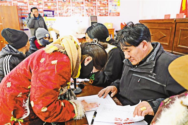圖為圓夢(mèng)新居社區(qū)群眾有序排隊(duì)、簽字、按手印,準(zhǔn)備領(lǐng)取分紅。記者 達(dá)珍 永青 攝
