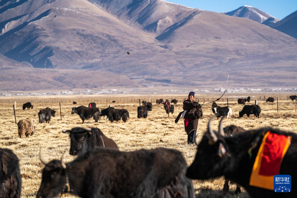 斯曲旺姆的兒子索朗羅達(dá)將家里的牦牛趕到牧場(chǎng)上(2月10日攝)。新華社記者 丁增尼達(dá) 攝