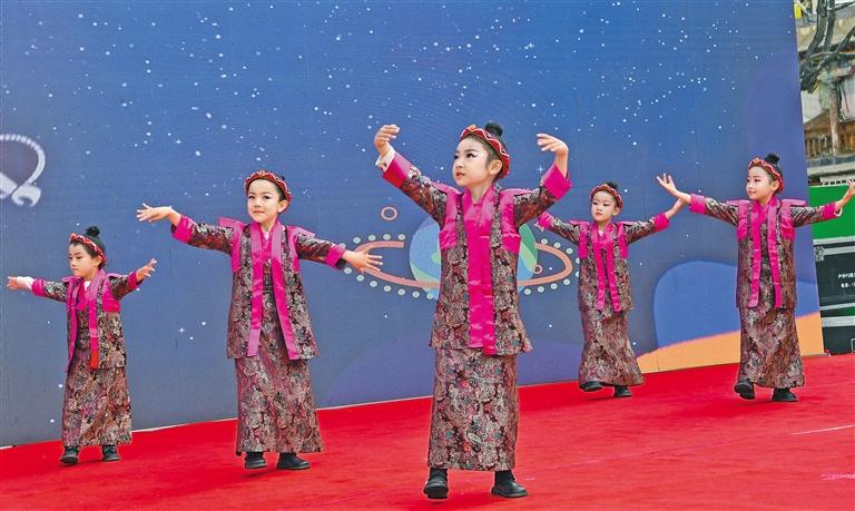 3月26日,拉薩市城關(guān)區(qū)吉崩崗街道黨工委組織街道各社區(qū)和轄區(qū)企事業(yè)單位開展“農(nóng)奴翻身做主人 哈達(dá)獻(xiàn)給共產(chǎn)黨”主題文藝演出。圖為城關(guān)區(qū)第八幼兒園小朋友表演舞蹈《美麗的仁增旺姆》。記者 洛桑 唐斌 攝
