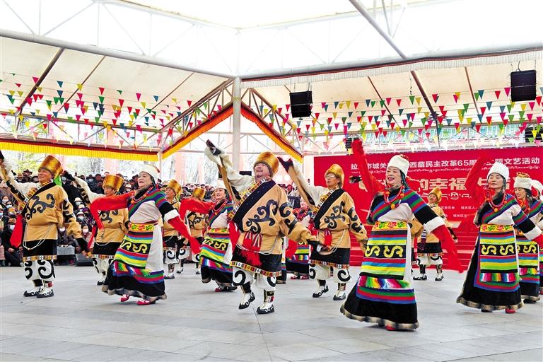 3月25日,由拉薩市城關(guān)區(qū)委、區(qū)政府主辦,城關(guān)區(qū)委宣傳部承辦的“我們的幸福生活”紀(jì)念西藏民主改革65周年文藝活動(dòng),在宗角祿康公園舉行?;顒?dòng)在開場歌舞《美麗的西藏·可愛的家鄉(xiāng)》中拉開序幕,現(xiàn)場觀眾熱情高漲,隨著歌舞旋律的起伏,不時(shí)報(bào)以熱烈的掌聲。此次文藝活動(dòng)充分展現(xiàn)了高原各族兒女對(duì)中國共產(chǎn)黨、偉大祖國和新時(shí)代的感恩之情。城關(guān)區(qū)委宣傳部常務(wù)副部長王全勝表示:“通過搭建文藝演出平臺(tái),各族群眾能夠一展才藝、分享幸福生活,讓大家零距離參與文化活動(dòng),既豐富了人民群眾的精神文化生活,又激發(fā)了大家共建幸福新西藏的熱情?!?/p>