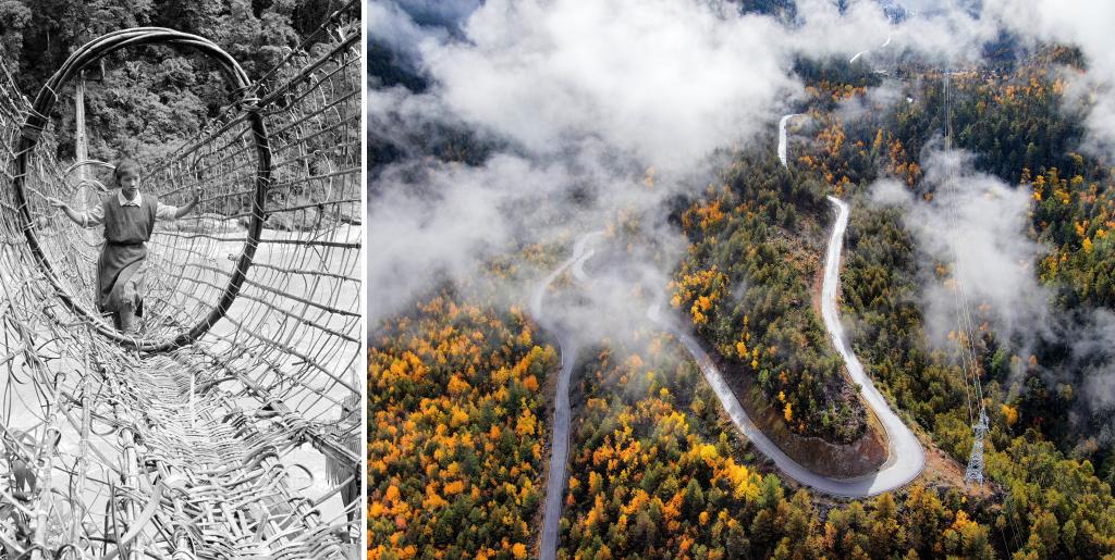 拼版照片:左圖是墨脫縣雅魯藏布江上的藤橋(20世紀(jì)80年代資料照片,新華社記者顧綬康 攝);右圖是2020年11月5日拍攝的派墨公路米林段公路。新華社發(fā)