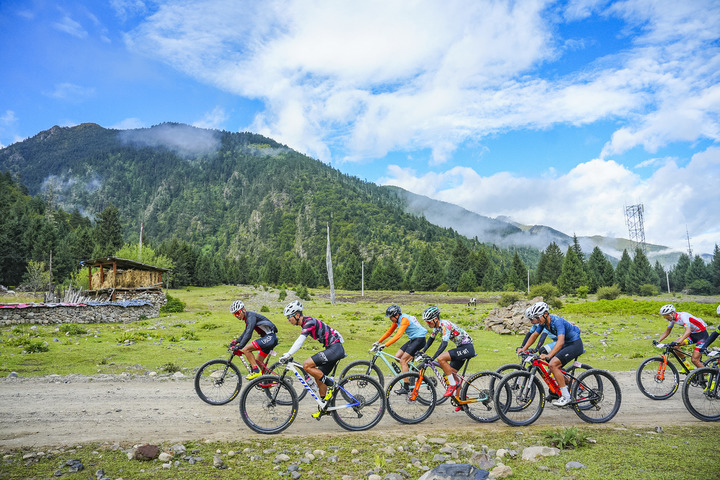 圖為2023年環(huán)巴松措山地自行車越野競(jìng)速賽比賽現(xiàn)場(chǎng)