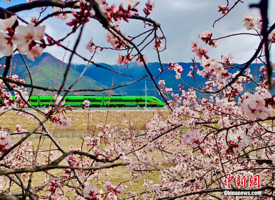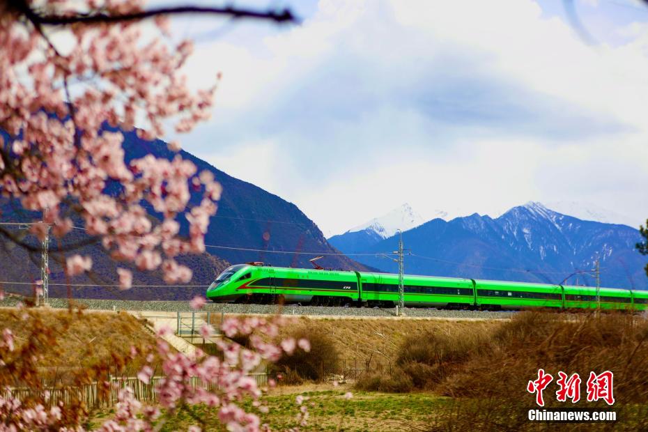 被譽(yù)為新“天路”的拉林鐵路,是中國(guó)首條高原電氣化鐵路,于2021年6月25日開(kāi)通運(yùn)營(yíng),結(jié)束了西藏東南地區(qū)不通鐵路的歷史。圖為拉林鐵路沿線桃花盛開(kāi),與飛馳而過(guò)的動(dòng)車構(gòu)成別樣風(fēng)景圖。馬生明 攝